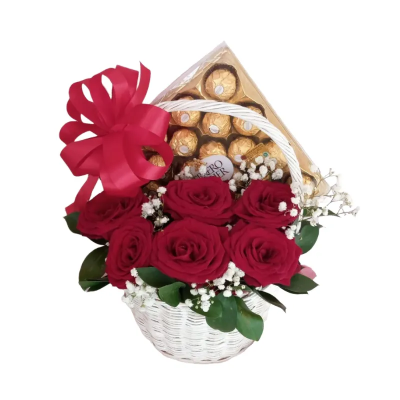 When words aren’t enough to express your affection, let a beautiful pairing of fresh red roses and indulgent chocolates speak on your behalf. “My Sweet” is more than a gift—it’s a heartfelt gesture wrapped in romance and sweetness. Perfectly arranged in a charming basket, this combination of 6 radiant red roses and 24 Ferrero Rocher chocolates brings charm, love, and a touch of luxury to any special occasion.
