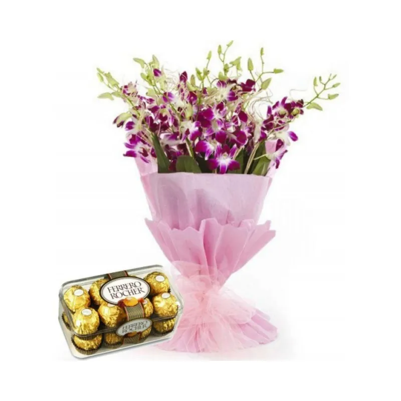 Orchids have long been admired for their exotic beauty and symbolism. Purple orchids, in particular, symbolize deep admiration, heartfelt respect, and meaningful emotional connections. Their rich color is captivating — like love that’s both bold and graceful. When paired with Ferrero Rocher, a chocolate known for its golden charm and luxurious taste, this bouquet becomes more than just a gift — it becomes a statement.
