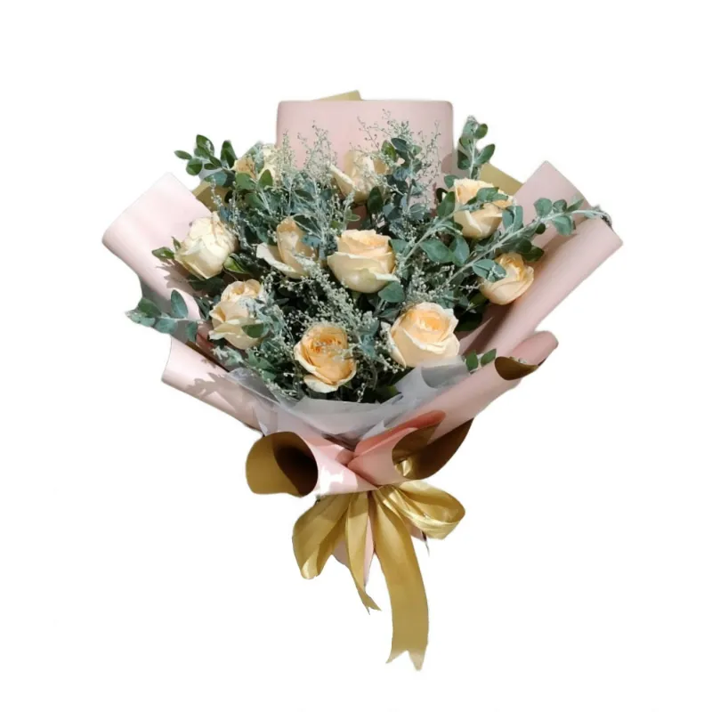 Peach roses may whisper instead of shout, but their message lands just as powerfully. And when wrapped in green, it feels like nature’s own love letter — subtle, warm, and everlasting.