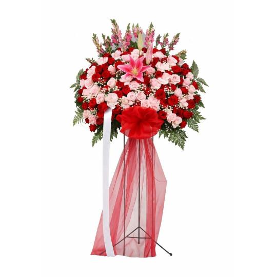 From the passionate red roses to the gentle pink blooms, every element is thoughtfully arranged to convey warmth and sincerity. Combined with its grand-standing presentation, this arrangement transforms any occasion into something truly unforgettable.