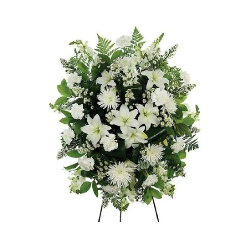 Made with a delicate blend of white lilies, carnations, chrysanthemums, and lush greenery, this arrangement speaks in the soft language of compassion, purity, and remembrance. Whether you’re offering condolences or sending a farewell, this floral tribute offers a gentle presence in sorrow.