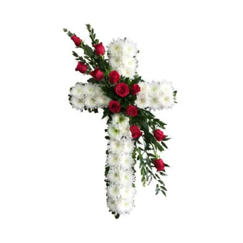 In times of sorrow and remembrance, expressing your love and respect can bring great comfort to grieving hearts. “Everlasting Peace” is a deeply symbolic floral cross, blending the gentle purity of white chrysanthemums with the rich, heartfelt beauty of red roses.